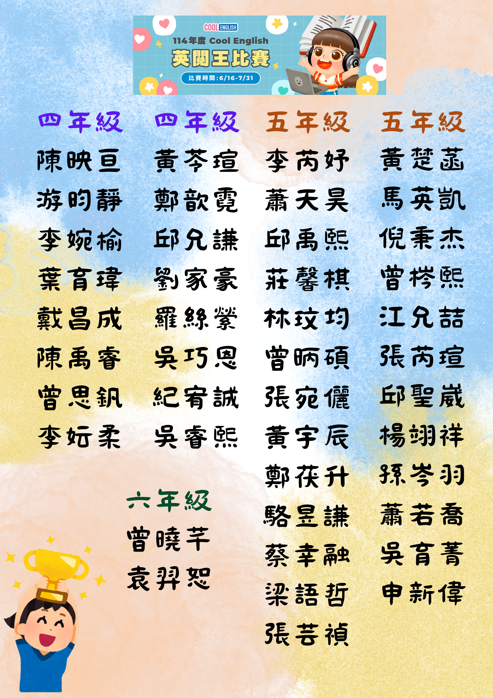 公告酷英英閱王得獎名單,恭喜本校43位同學獲得此殊榮!!