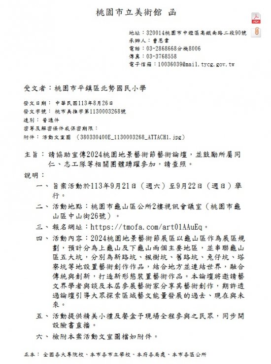 主旨:請協助宣傳2024桃園地景藝術節藝術論壇,並鼓勵所屬同 仁、志工隊等相關團體踴躍參加,請查照。