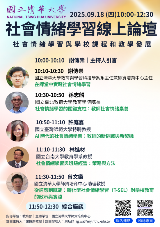 二、 | 查旨揭論壇聚焦SEL於課堂實踐、教師素養培養、AI時代挑戰、班級經營及T-SEL應用等,透過專家講座與實務交流,探討SEL如何融入課程與教學,促進師生關係與學生發展,辦理相關資訊如下: |