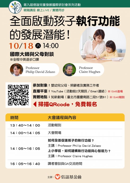 一、 孩子明明知道,卻做不到?耳提面命要專心,卻老是分心?約定好的規則,動不動就推翻不認?很多時候不是孩子不聽話,而是「執行功能」還在發展的緣故。執行功能就像大腦的指揮官,影響著學習、思考、行動與適應環境,更與情緒調節、控制衝動息息相關。信誼將於2025年10月18日(六)下午2:00-4:40舉辦【全面啟動孩子執行功能的發展潛能!】實體/線上LIVE 講座,誠摯邀請 家長、照顧者、實務工作者 免費報名參加。